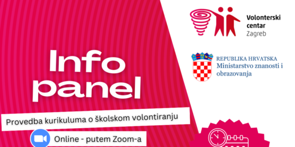 ➡ Volonterski centar Zagreb organizira info panel pod nazivom „Provedba kurikuluma o školskom volontiranju“ koji se provodi u sklopu projekta Ministarstva znanosti i obrazovanja “Volonterstvo u školama – zajedno za humanije društvo”.